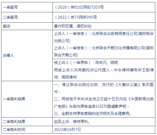 由著名翻译家陈来元、胡明等翻译的《大唐狄公案》在豆瓣读书评分高达9分,被列为豆瓣十部高分推理悬疑小说之一,广泛受到读者好评。2019年,陈来元、胡明(以下统称“原告”)发现,由联合出版公司出版的《大唐狄公案》系列图书,系抄袭自原告在先翻译的作品,故将被诉侵权图书的出版社及经销商诉至北京市西城区法院。本案经一、二审法院审理,通过细节对比,认定被诉侵权图书抄袭了其他译者具有独创性的表达,与权利图书的内容构成实质性相似,最终判令抄袭方承担侵权责任。